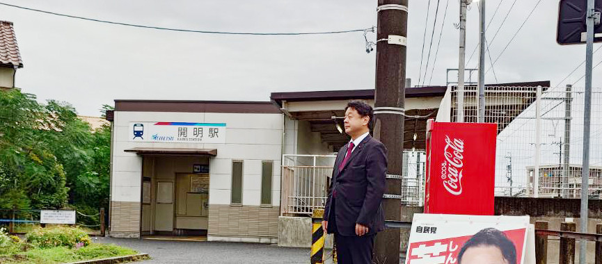 開明駅にて朝の活動をさせていただきました。目の前の踏切はあらゆる(5つの)方向から、ここを渡る車が、進入して、歩行者には大変危険な光景を目にしました。